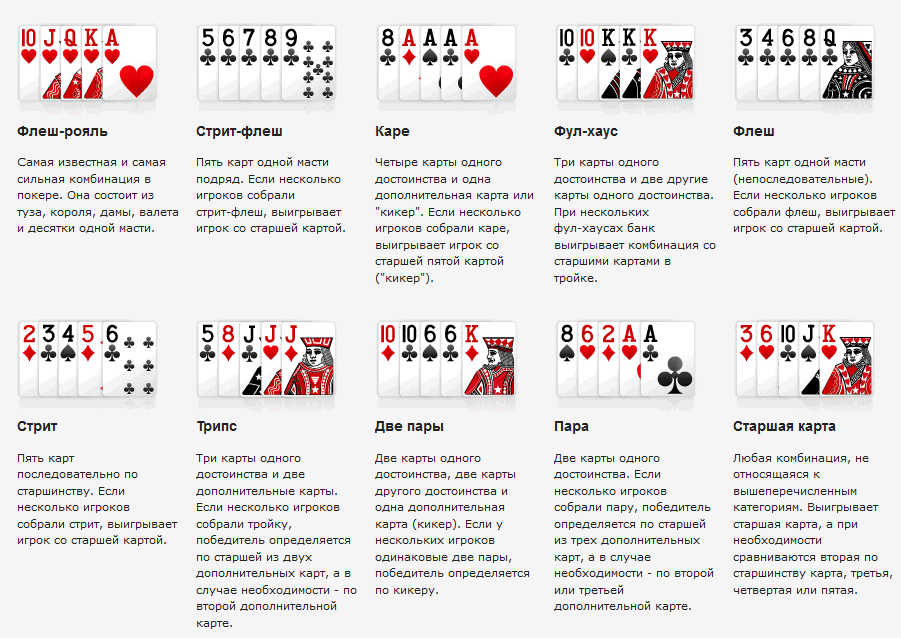Как и в других разновидностях покера, в безлимитном Техасском Холдеме для составления комбинаций используется пять карт. Сочетания здесь традиционные, как и их старшинство. Для тех, кто незнаком с покерными комбинациями, представляем вниманию таблицу с ними, начиная с самого сильного сочетания: