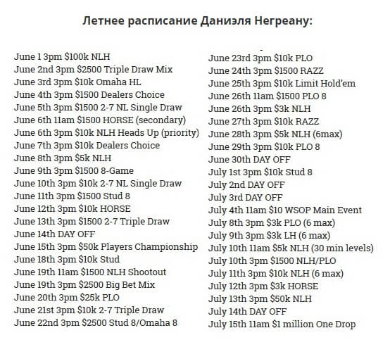Даниэль Негреану успел заработать на покере десятки миллионов долларов. Но он не останавливается на таких достижениях, игрок продолжает принимать участие в живых ивентах. С читателями своего блога он недавно поделился расписанием предстоящей игры, куда вошло 39 турниров. Бай-ины к ним стартуют от 1500 долларов.