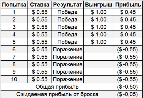 Но если нужно будет за выпадение решки уплачивать не 50, а не менее 55 центов, то тогда ЕВ будет вовсе отрицательным: