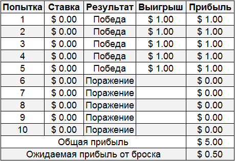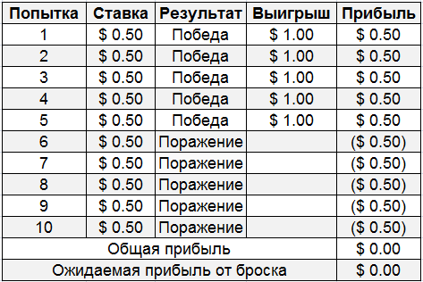 Здесь расчеты предельно просты. В первую очередь нужно отталкиваться от теории вероятности. Согласно ей, в 50% случаев будет выпадать орел, а в остальных 50% - решка. А значит, подкинув 10 монетку, в 5 случаях выпадет орел. За это мы получим прибыль в 5 долларов, она будет здесь общей – на все 10 бросков.