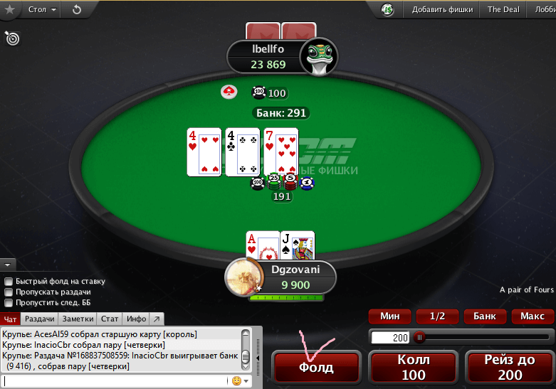 Важно учесть, что фолд в покере подразумевает не только выход из раздачи, но и потерю всех денег, которые вы ранее вложили в банк. После принятия такого решения, покерист не может претендовать на розыгрыш пота в текущей партии. Но он вправе принять участие в другой раздаче.