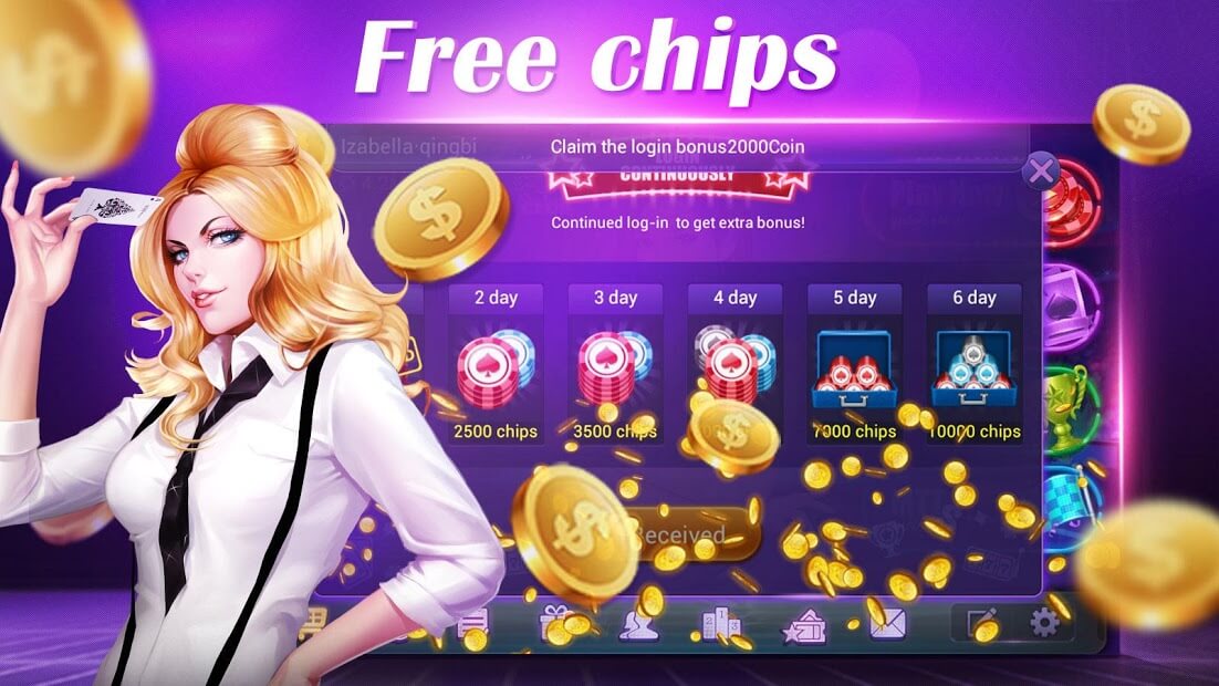 У вас в распоряжении будет 3500 бонусных фишек, чтобы начать игру. Полагаете, что этого мало? Запускайте чаще приложение, принимайте активное участие в раздачах и турнирах, и у вас будет больше игровых денег на счету. Также для всех игроков предусмотрены здесь ежедневные бонусы.