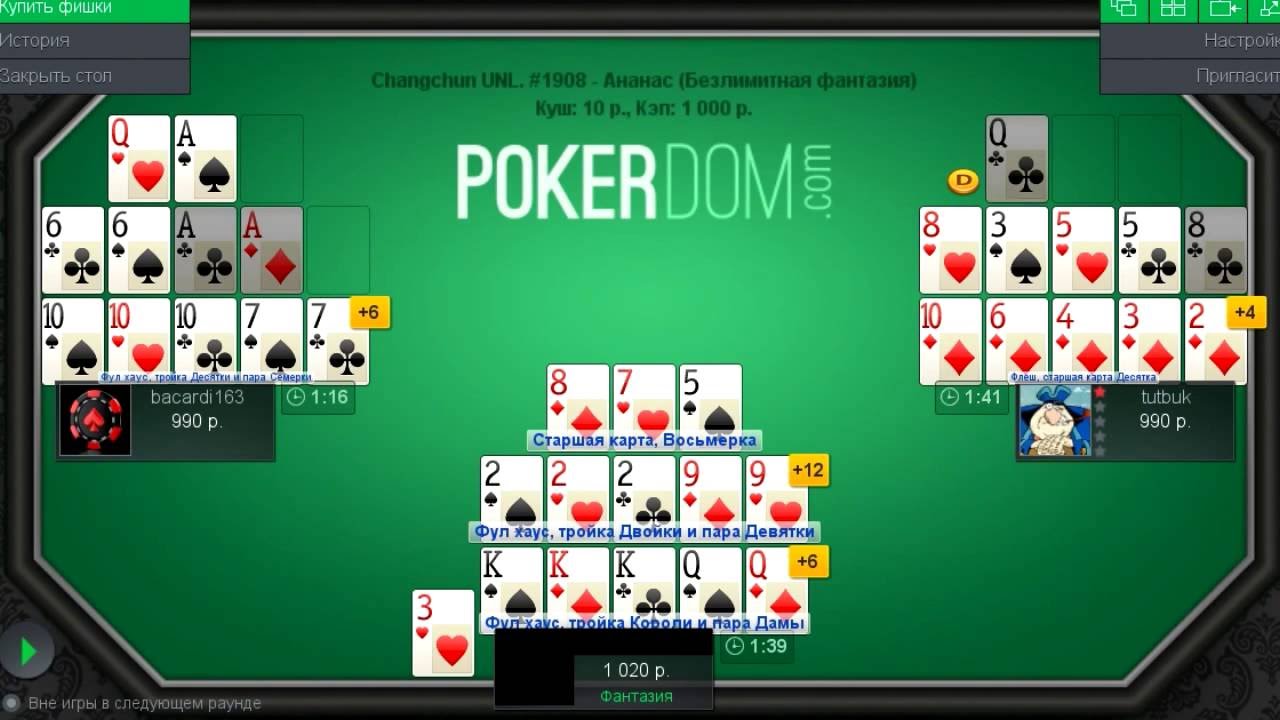 В руме PokerDom китайский покер «Ананас» пользуется большой популярностью среди игроков. Вот почему всегда можно найти кэш-столы с нужными лимитами и отыграть несколько раздач в Chinese Poker. Кроме того, здесь регулярно проводятся турниры по такой карточной игре.