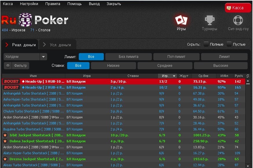 В руме RuPoker вы сможете принимать участие в раздачах за кэш-столами. Также вас ждет здесь такой формат игры, как Boost Poker. Здесь у вас будет возможность пересаживаться за новый стол сразу же после сброса карт, не дожидаясь окончания раздачи.