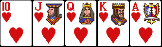 Самая сильная комбинация – Royal Flush. На русском она звучит так: Роял Флеш. Такая комбинация очень редкая, вот почему собрать ее – настоящая удача для любого игрока, в том числе и для настоящего профи в мире покера. Как же выглядит такая комбинация? Она состоит из последовательно идущих карт, начиная от 10 и заканчивая тузом. Все карты должны иметь одинаковую масть.