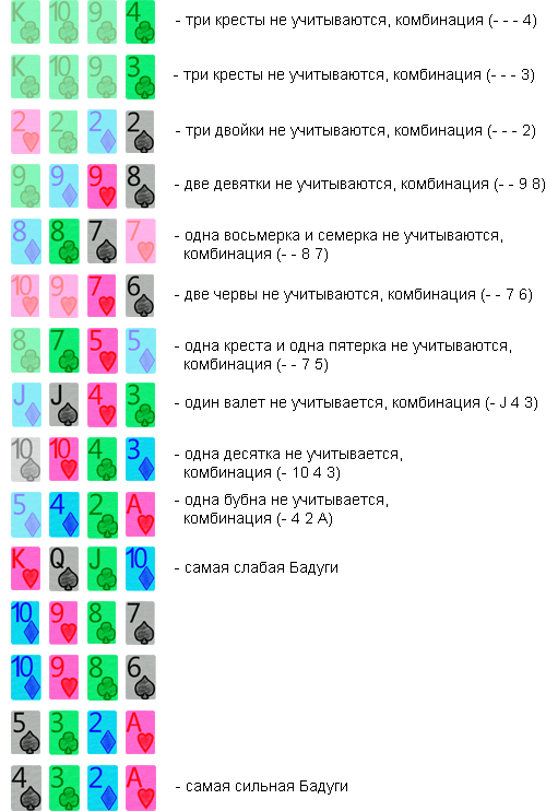 Безусловно, игрокам не всегда удается собрать полноценную четырехкарточную комбинацию Бадуги. Но победитель должен быть все равно определен. Вот почему тогда сравниваются три карты, которые не совпадают по рангу и мастям. Если же и таких комбинаций не будет у игроков, то тогда анализируются пары, и в крайнем случае – наиболее старшая по рангу карта. Давайте же рассмотрим, как выглядят комбинации в покере Бадуги в порядке возрастания: