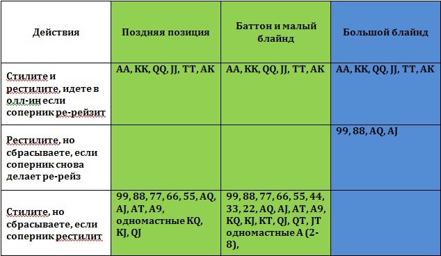 При игре против блайндов, принимайте во внимание этот чарт рук: