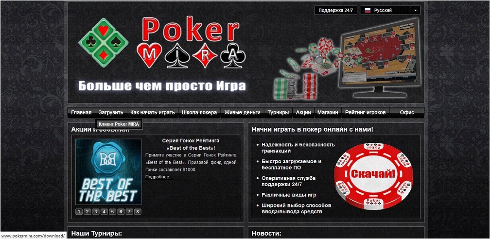 В руме PokerMira ждет круглосуточная техподдержка. Депозиты и кэш-ауты производятся здесь быстро. Работает рум с большинством популярных платежных систем, в числе которых VISA, RBK Money, WebMoney, Money Mail, Liqpay, Exchang Money.