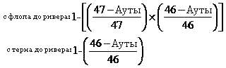 Но если вы хотите выполнить расчеты для двух карт, которые придут, скажем, от флопа до ривера, то тут вычисление чуть сложнее. В ходе них потребуется исключить из подсчетов вероятность, что одна и та же карта придет дважды. А значит, мы подсчитываем вероятность и отнимаем от нее 100%. Предлагаем вам ознакомиться с конкретными примерами таких вычислений: