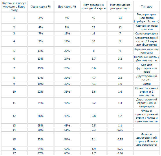 - Соответственно, в колоде осталось 15 (8 аутов + 9 аутов и 2 аута) карт для улучшения руки, а не 17 (8 аутов + 9 аутов).
