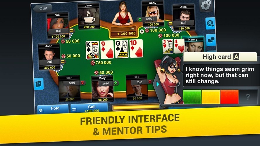 Выбирая данное приложение, вам предстоит вести борьбу против восьми виртуальных соперников. У вас будет возможность пасовать, делать фолд и колл, совершать повышения и идти ва-банк. Конечно же, можете прибегать к блефу, если полагаете, что сможете вынудить других соперников уйти в пас.