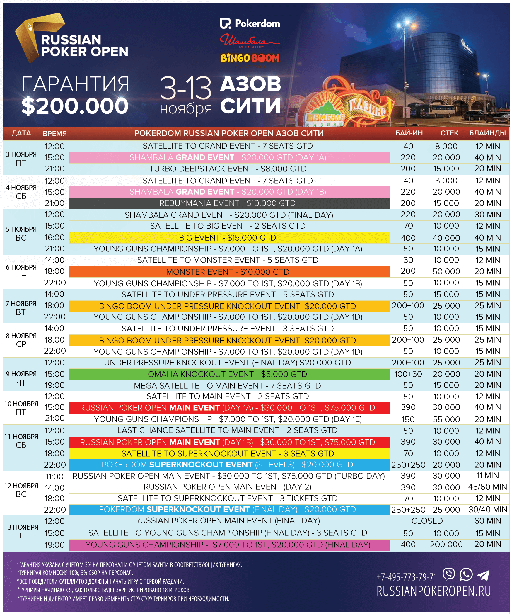 Поскольку RPO еще не начался, то в руме PokerDom вовсю проходят отборочные турниры к предстоящему событию. Каждый может принять участие в сателлитах и попасть на оффлайн-серию с наименьшими затратами. Они будут проходить 25 сентября по 5 ноября включительно. Представляем вашему вниманию расписание на Russian Poker Open: