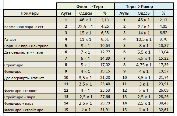 Вычисления аутов не отличаются сложностью. Более того, уже существуют готовые таблицы со всеми необходимыми расчетами. Таким образом, игроку лишь остается опираться на данные в них, чтобы узнать свои шансы на получения нужных карт:
