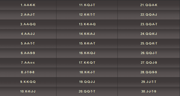 С учетом важности в покере Омаха дро-комбинаций и большего количество этапов торговли, мы составили ТОП-30 стартовых рук, с которым можно смело продолжать игру. Он выглядит следующим образом (Х – любая карта, Т – десятка, J – валет, Q – дама, K – король, А – туз):