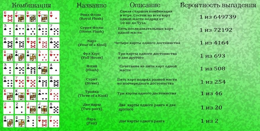Основы покера также включают в себя комбинации. Они формируются всегда из пяти карт и имеют свое старшинство. Чем сильнее карточное сочетание, тем сложнее его собрать. Но при этом оно дает намного более высокие шансы на получение выигрыша. Всего в покере 10 комбинаций. Представляем их вашему вниманию: