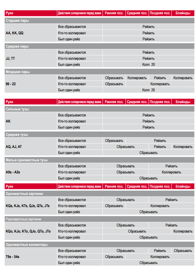 Так, вам будет предложены конкретные руки (например, пара королей), указана позиция покериста (скажем, на баттоне). Вам потребуется выбрать наиболее оптимальный ход в конкретном раскладе. Чтобы сориентироваться, используйте таблицу стартовых рук, где представлены правильные действия для каждой позиции с конкретными картами:
