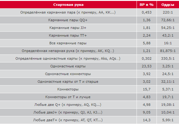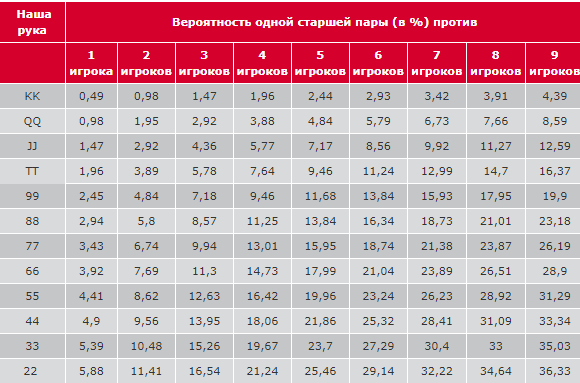 В викторине встречаются вопросы и по вероятностям. В некоторых из них озвучиваются карты флопа и последующих улиц, а в других нет. Но в любом случае без соответствующих таблиц здесь не обойтись. Представляем их вашему вниманию: