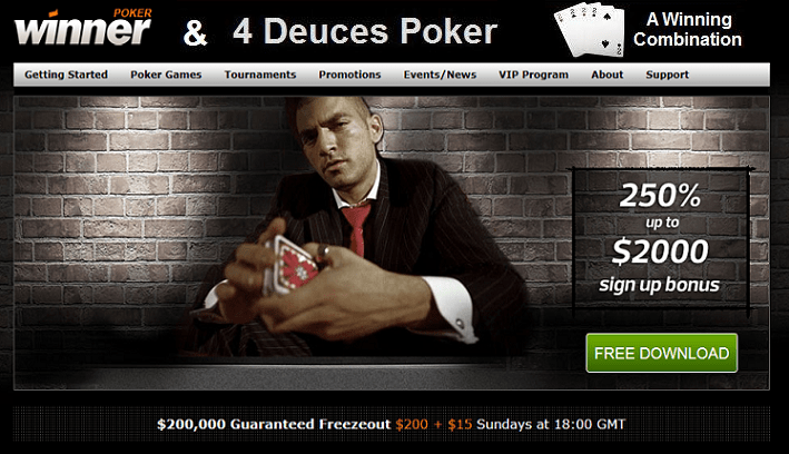 Один из крупнейших зарубежных румов Winner Poker предлагает новым клиентам бонус на первый депозит до 2000 долларов. Такая сумма заинтригует даже самых искушенных игроков. Впрочем, ее удастся получить, если вы сделаете солидный депозит на свой счет, поскольку, как и в других румах, размер бонуса зависит от внесенной суммы. К своему первому депозиту вы получите 250%, что весьма щедро.