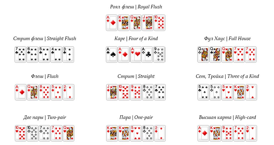 Всего в покере существует 10 комбинаций, которые также принято называть покерными сочетаниями. Чем сильнее комбинация, тем выше шанс победить в раздаче. Представляем вашему вниманию сочетания, идущие от самого сильного к слабому: