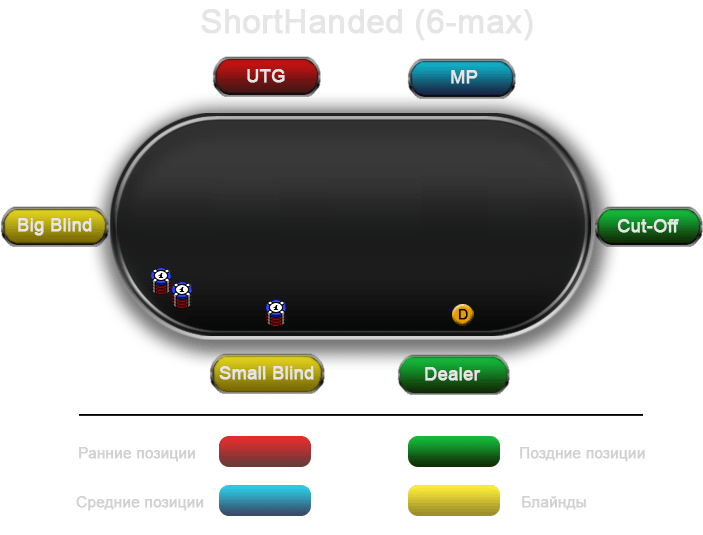 Теперь давайте рассмотрим все эти позиции в покере за кэш-столом 6-max более подробно. Тогда вам будет намного проще правильно их оценивать и выбирать более эффективные тактики игры.