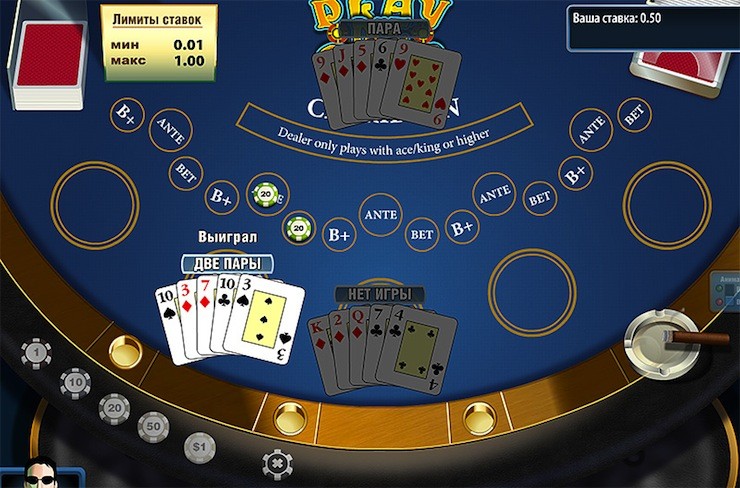 - У крупье «нет игры». Под этим подразумевается, что у дилера нет ни одной выигрышной комбинации, даже туза с королем. В этом случае игроку выплачивается выигрыш в размере одного Анте, при этом по бету расчеты не производятся. Такая ставка уходит в пользу казино, что совсем невыгодно для игрока.