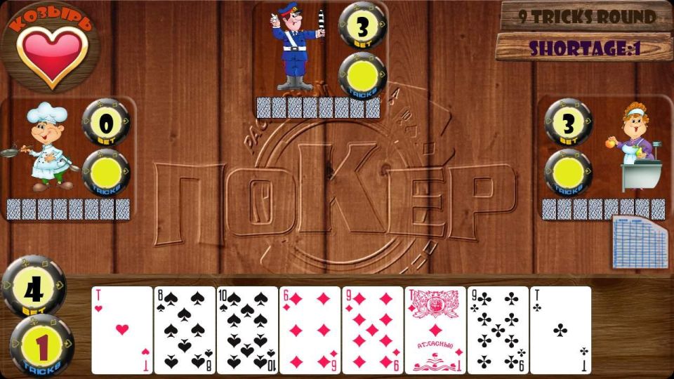 - При недоборе с покериста удерживается по 10 очков за каждую недобранную взятку.