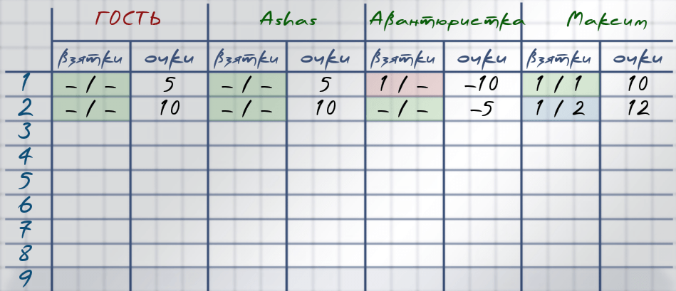 - Когда участник партии делал пас и не брал ни одной взятки, то он получает 5 очков.