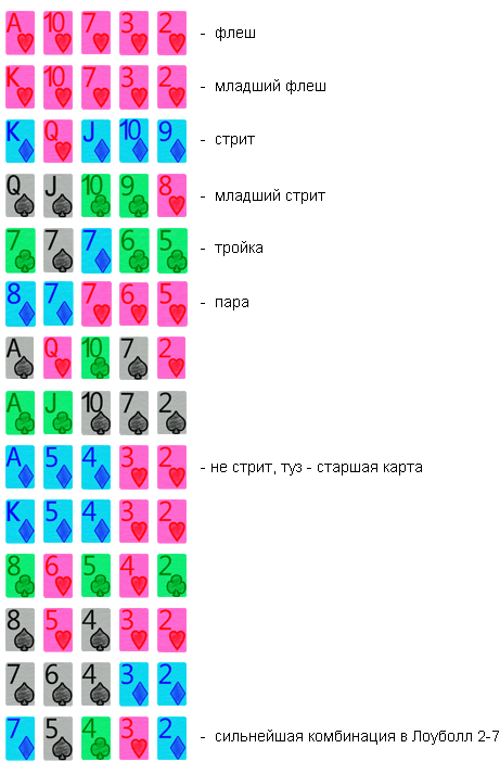 Отдельно остановимся на комбинациях в такой разновидности покера. В Сингл-Дро 2-7 их старшинство отличается от того, которое присутствует в Техасском Холдеме. Вот почему пары, сеты, стриты и флеши тут обычно не выигрывают, не говоря уже о комбинациях более высокого порядка. Побеждает игрок с самым слабым карточным набором.