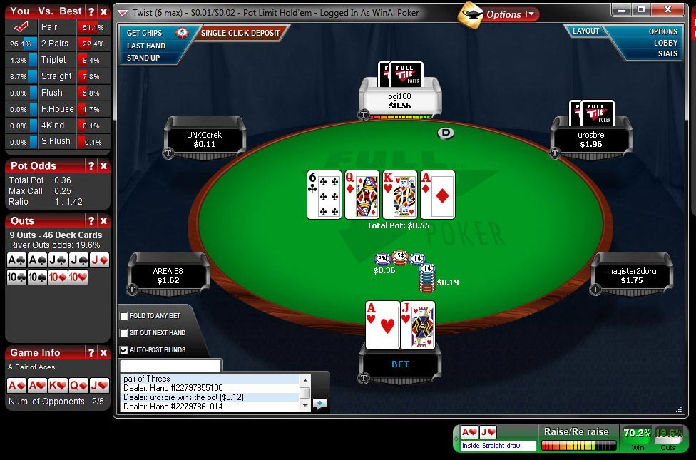 - Tournament Indicator – софт, который предназначен для проведения вычислений в рамках турниров. ПО самостоятельно считывает данные в ходе игры, анализирует их и выводит все необходимые показатели. Вы сможете узнать ценность своих карт, количество аутов, позицию за столом, Win Odds, Pot Odds, Hand Odds, EV и многое другое. Все это позволит вам отыгрывать турнирные события более успешно и попадать чаще в число призовых.