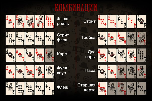 Мы обязательно расскажем вам о каждой комбинации отдельно. Но сначала продемонстрируем, как выглядит расклад карт в покере в картинках. Тогда вам будет намного легче запомнить его: