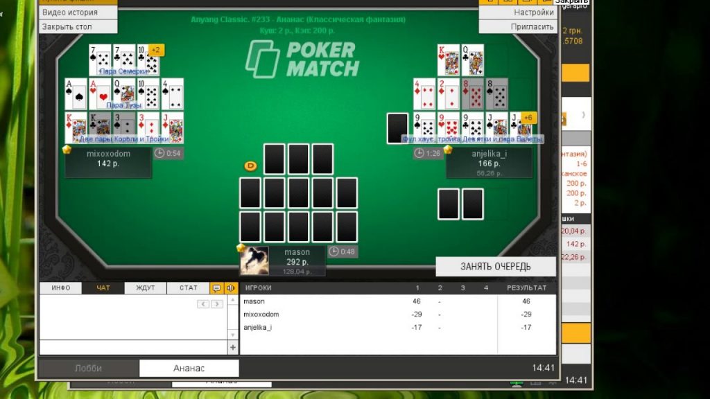После скачивание ПО от PokerMatch себе на устройство, останется установить его. Затем нужно перейти на сайт рума, пройти регистрацию и использовать логин и пароль для входа в клиент на ПК или девайсе. После чего вы попадете в лобби, где сможете выбрать вкладку с китайским покером «Ананас» и найти для себя подходящие кэш-столы. В них никогда не наблюдается дефицита. Среди клиентов PokerMatch китайский покер пользуется особой популярностью.