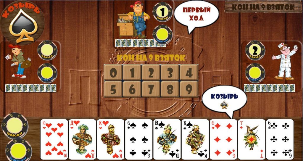 Если говорить кратко о правилах, то в рамках раздачи могут принимать участие от 2 до 10 человек. В ходе нее каждый получает столько же карт, сколько игроков собралось за столом. После чего выбирается козырь, а потом каждый участник указывает желаемое количество взяток. Затем тот игрок, у кого самый старший козырь, делает первый ход в онлайн игре. Он выкладывает одну из карт на стол, после чего оппоненты должны сделать одно из следующих действий: