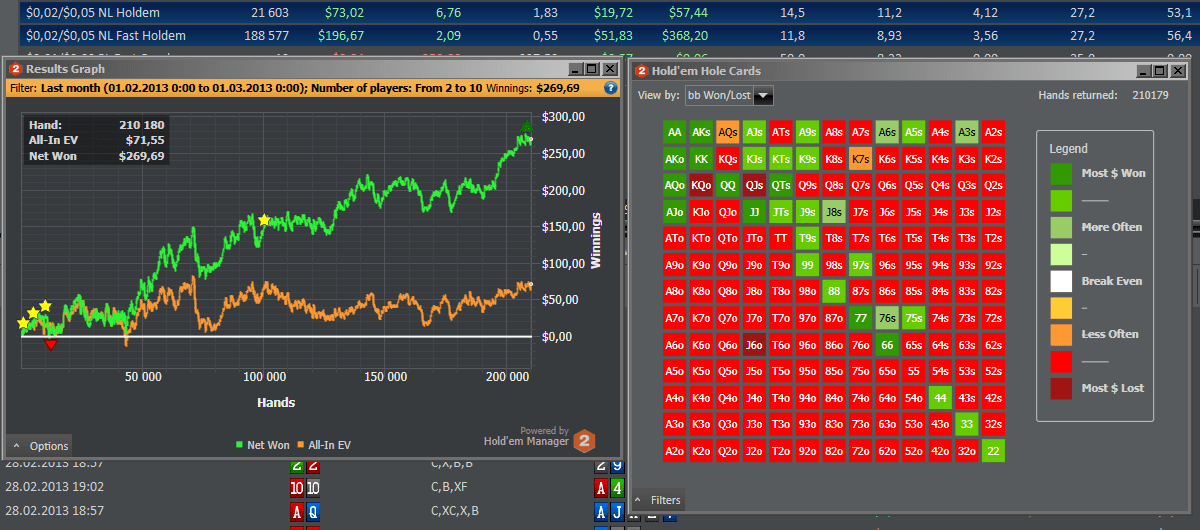 Holdem Manager предусматривает и многие другие полезные функции, в том числе возможность делать заметки по оппонентам, расширять статистику по своей игре, подразделяя ее по стартовым хендам, количеству столов и другим показателям. Безусловно, полезных функций в Holdem Manager предостаточно. Вот почему такое приложение стало очень популярным среди покеристов.