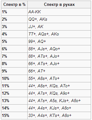 Что касается диапазона рук противников, то лучше всего использовать таблицу, где указывается спектр непосредственно в картах и отображается в процентах. Логика таких таблиц проста – чем меньше процент диапазона, тем сильнее рука у соперника. Например, спектр в 2% будет намного сильнее, чем диапазон в 10%. Представляем вашему вниманию такую таблицу: