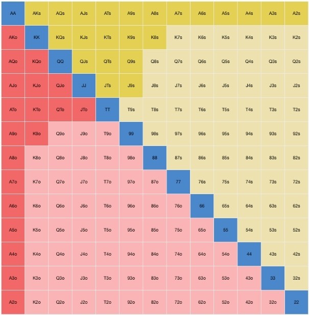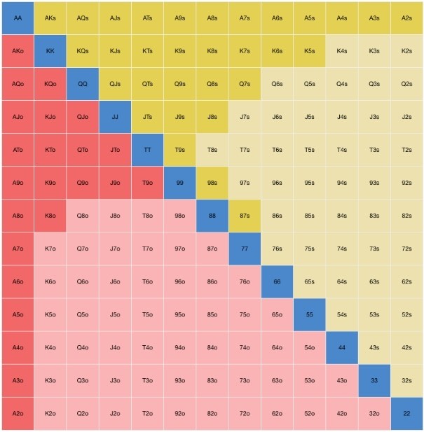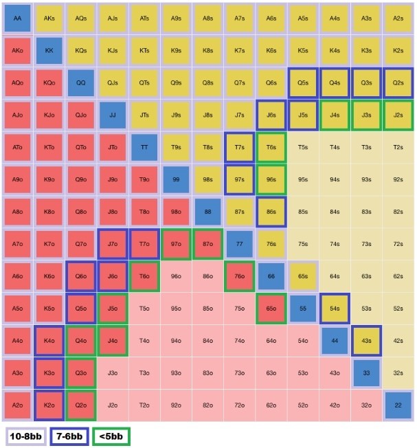 Игра может происходить вне позиции. Тогда стратегия игры должна предусматривать мини-рейзы в 2,5 ББ. В этом случае соперники чаще будут совершать фолды, чем коллы. Если стек составляет не менее 10 ББ, то тогда прибегайте к следующей таблице чарта, где вам подойдут руки синего, красного и желтого цвета:
