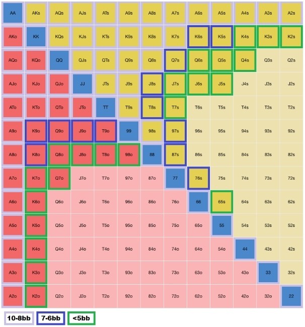 Помните, что чем меньше размер вашего стека в Спин-энд-гоу , тем шире диапазон для пуша по по рассматриваемой нами стратегии. Так, если он составляет 8-10 ББ, то тогда делайте олл-ин с руками, которые обозначены в таблице серым цветом. Когда стек равен 6-7 ББ, то добавляйте к диапазону еще и те руки, которые отмечены синим цветом. Когда стек меньше 5 ББ, то тогда делайте олл-ин с руками, которые помечены серым, синим и зеленым цветом.