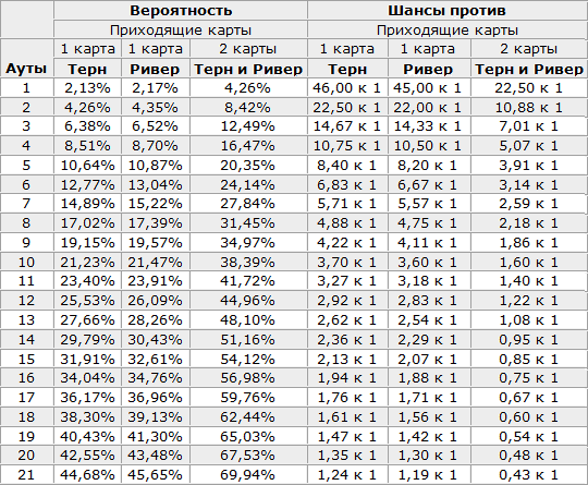 Таблица аутов в покере