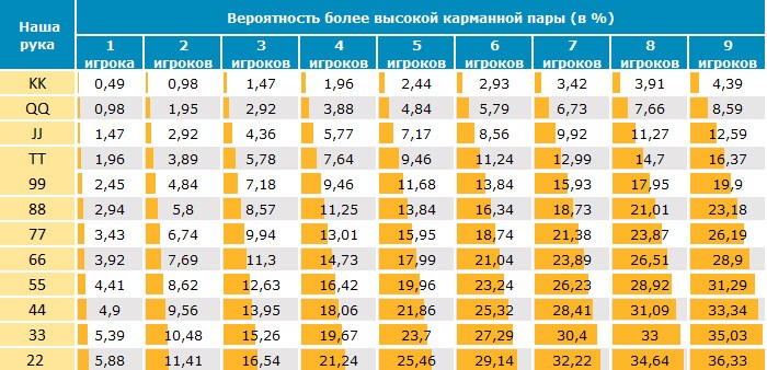 Также есть еще одна таблица в покере, касающаяся стартовых рук. В ней доступны расчеты по вероятности выигрыша для каждой руки с разным количеством оппонентов. Здесь представлены вероятности столкнуться с более высокой парой: