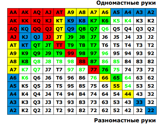 Обратите внимание, что подходящие карты для ранней позиции, можно разыгрывать и для последующих. Так, например, если квадратик окрашен в желтый цвет, то их рекомендуется разыгрывать как в средней позиции, так и на последующих. Иными словами, спектр стартовых рук расширяется непрерывно в сторону поздних позиций.