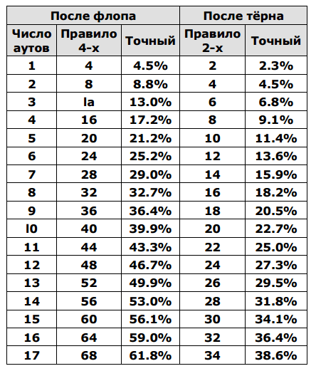 Чтобы пользоваться этой таблицей в покере, вы должны знать количество аутов для своей руки. Определять их очень просто. Нужно подсчитать, сколько карт в колоде еще осталось для составления нужного вам сочетания. Выявив количество аутов, вы сможете узнать вероятность улучшения руки.