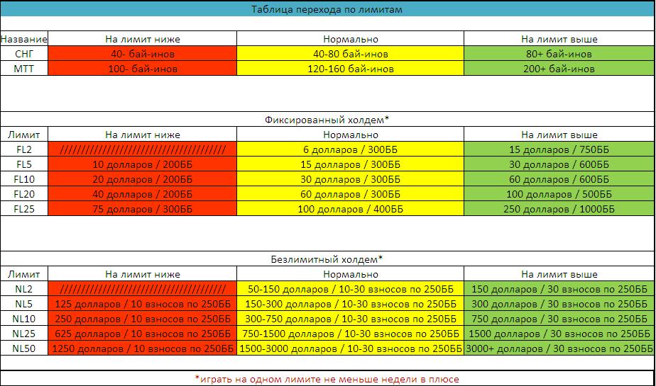 В этой таблице покера указано, сколько денег на игровом счету вас должно быть в соответствии с конкретными бай-инами к турнирам и лимитами за кэш-столами. Также есть еще одна таблица, в которой указана необходимая величина для банкролла в соответствии с количеством бай-инов. Она предназначена для турнирного покера и покажет вам, сколько нужно иметь денег на счету и когда нужно преступать к игре на более высоких лимитах и когда стоит перейти к турнирам с менее высокими бай-инами: