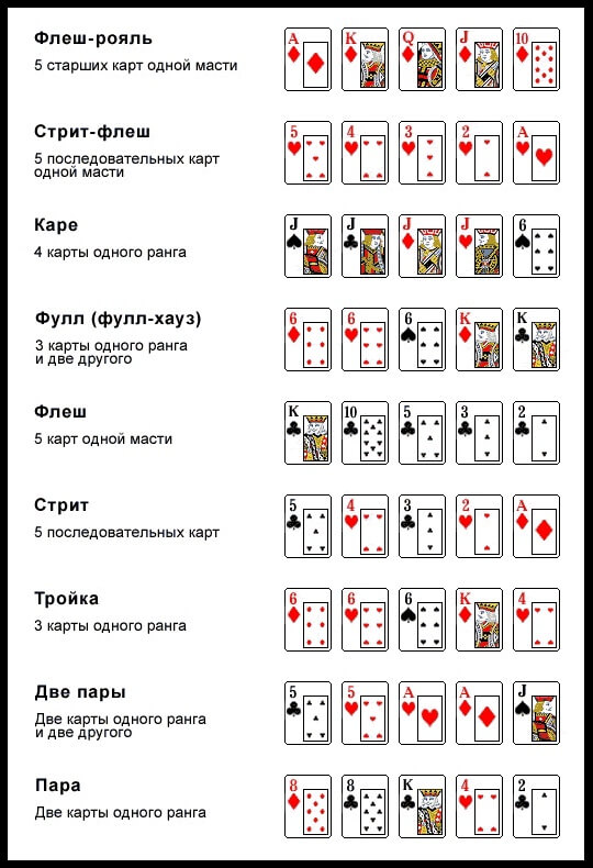 Начнем с комбинаций для Хай-игр. Их потребуется собирать при игре в Техасский Холдем, Стад, Омаху, 5-карточный Дро. В таких вариациях покера побеждает покерист с самой старшей комбинацией. Предлагаем вам покерную таблицу, где сочетания расположены в порядке убывания силы, сверху вниз: