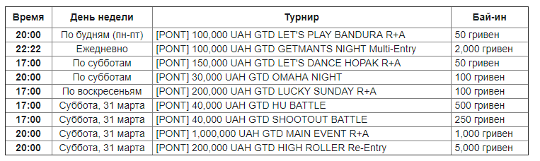 Такая турнирная серия будет проходить весь март. Общая гарантия PONT составит более 10 000 000 гривен. Все турниры, которые будут проходить в рамках нее, будут разделены на две группы: ежедневные и титульные.