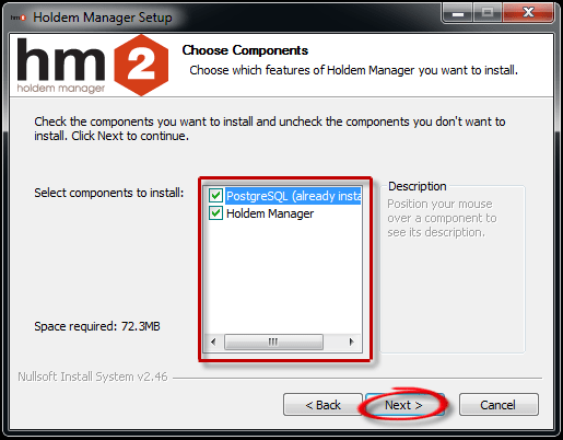 Откроется новое окно, как представлено ниже. В нем потребуется поставить галочки напротив пунктов «Holdem Manager» и «PostgreSQL», а потом нажмите на кнопку Next.