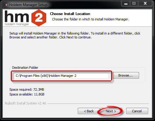 Теперь укажите папку, в которую будет устанавливаться программное обеспечение Холдем Менеджер 2 и кликните на кнопку Next.