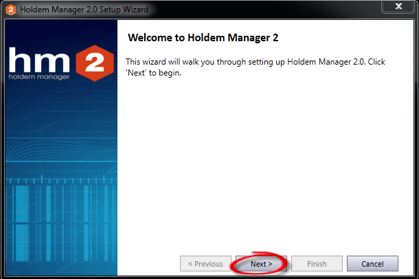 Когда завершен процесс установки, то у пользователя возникает вопрос: как настроить Holdem Manager? Здесь есть свои нюансы, на которых мы и остановимся. Для начала вам потребуется запустить данную программу, кликнув по ее ярлыку на рабочем столе. Откроется окно, где нужно кликнуть на кнопку Next.