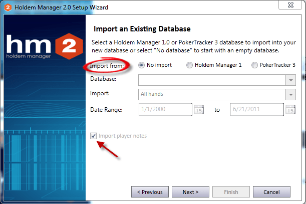 Откроется окно, где будет предложено импортировать уже существующие на вашем компьютере базы данных от программ PockerTracker 3 и Holdem Manager 1. Если таковые имеются, то укажите необходимые. Если же базы данных нет, то выберите пункт No import и нажмите на кнопку Finish.