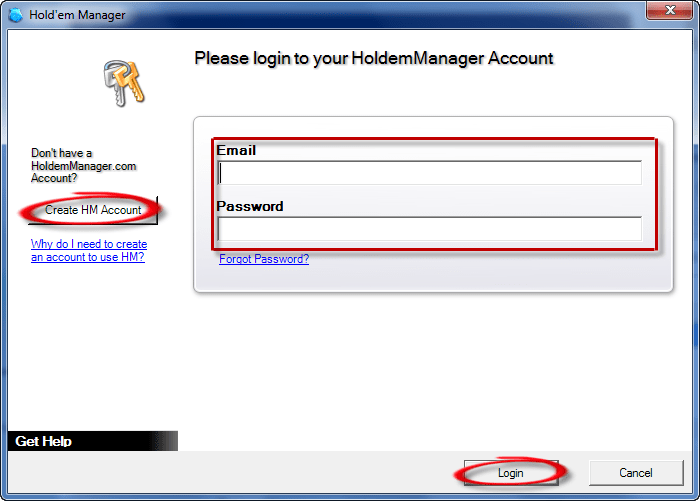 На следующем этапе потребуется указать логин и пароль, которые вы использовали при авторизации на официальном сайте Holdem Manager. Если же вы не создавали там аккаунт, то можете сделать это тут же, нажав в представленном окне на кнопку Create HM Account.