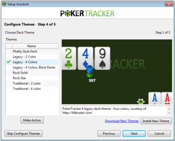 На завершающем этапе настройка Poker Tracker 4 предполагает выбор темы отображения стола, рубашки карт, аватаров соперников. Софт предусматривает несколько встроенных тем, но можно загрузить и свою, воспользовавшись опцией Import New Theme.
