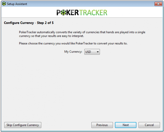 В первую очередь настройка Poker Tracker 4 предполагает выбор валюты, в которой вы привыкли играть. При этом если на вашем счету в румах будет иная валюта, то софт будет самостоятельно переводить ее в выбранную. Впрочем, при желании вы можете пропустить данный шаг, для этого кликните на Skip Currency Conversion.